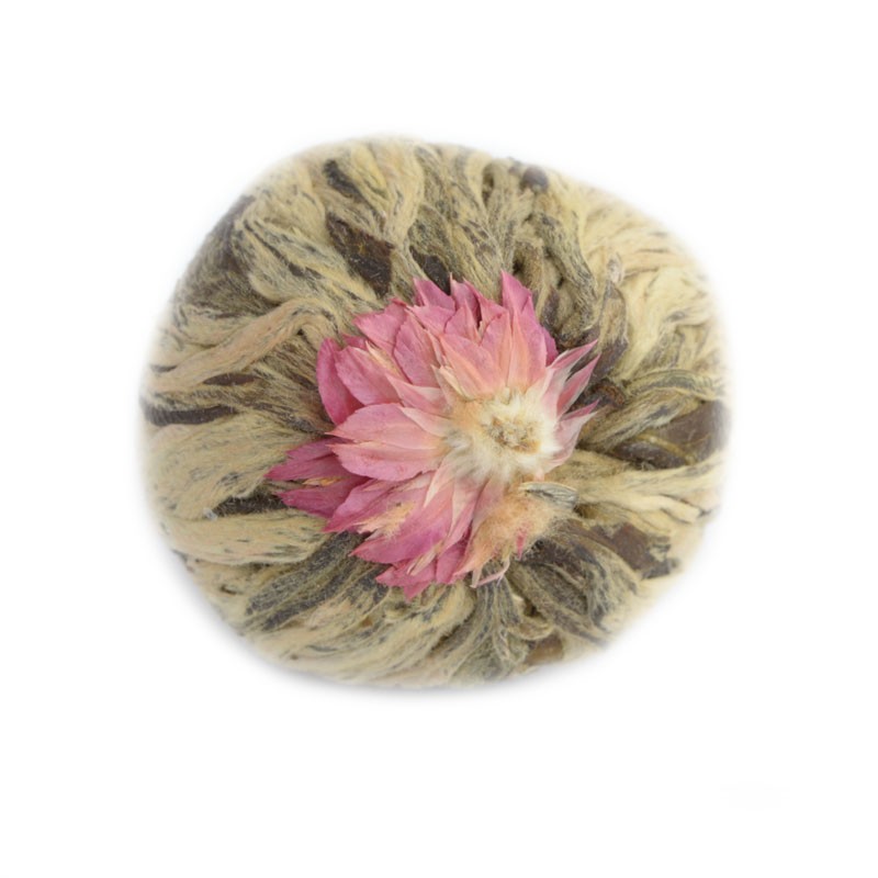 Blühender weißer Tee mit natürlichem Jasmingeschmack, kugelförmig gerollt und mit einer rosa Blüte verziert.