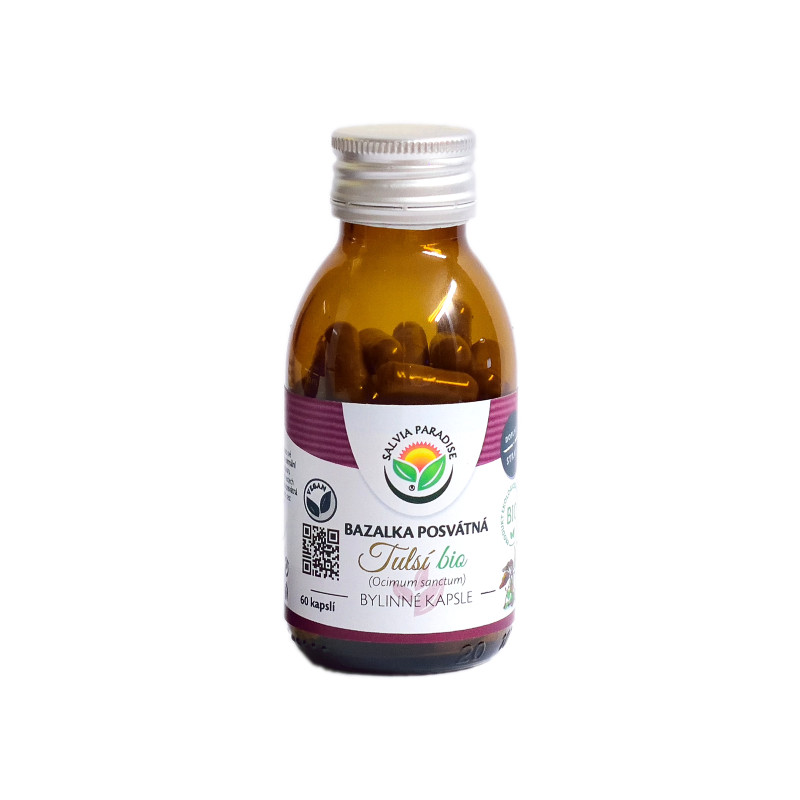 Heiliges Basilikum oder Tulsi ist ein mehrjähriges Kraut, das in Südasien heimisch ist. Sie bildet einen Strauch, der etwa 30–60 cm hoch wird. Die Frucht des heiligen Basilikums sind vier kleine braune Samen. Das Kraut hat grüne oder violette Blätter, reich an ätherischen Ölen, und verbreitet ein angenehmes, charakteristisches Aroma.
